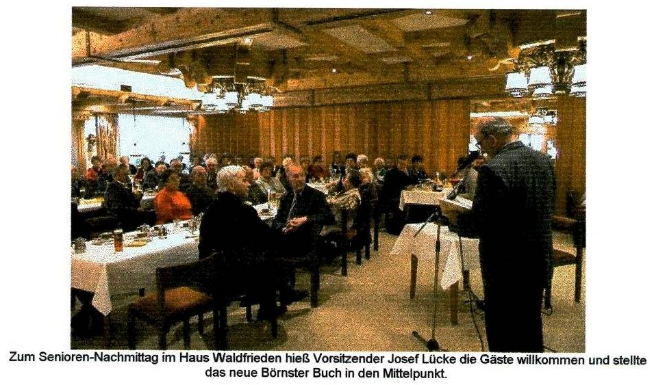 Vorsitzender Josef Lücke rückte mit verständlichem Stolz das neue Buch in den Mittelpunkt des gemütlichen Nachmittags bei Kaffee und Kuchen im Haus Waldfrieden. Zu der Video-Präsentation durch den Autor Heinz Potthoff war auch Bürgermeister Jan Dirk Püttmann eingeladen und gern gekommen. Er sei, sagte er, von dem umfangreichen Werk der Börnster über Börnste mächtig beeindruckt. Auch der Ex-Bürgermeister und Ex-Börnster Karl Ridder war begeistert.