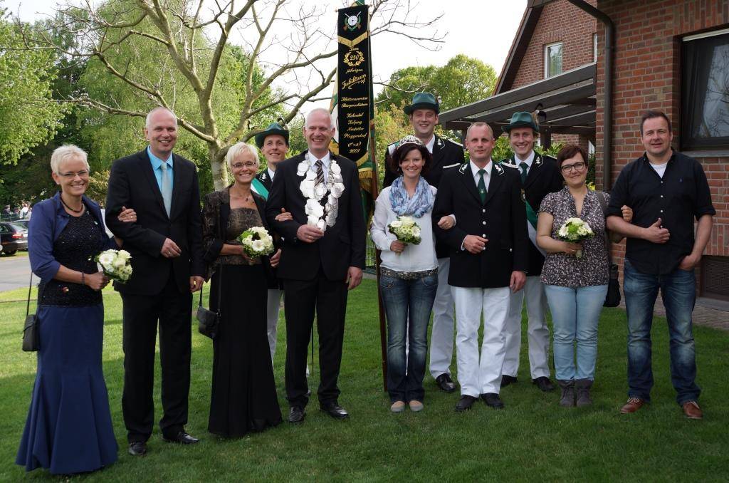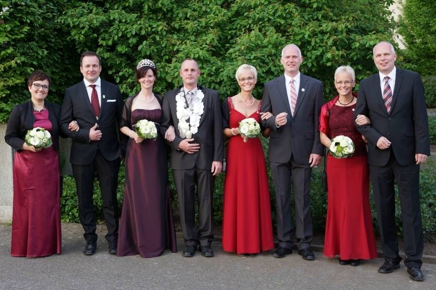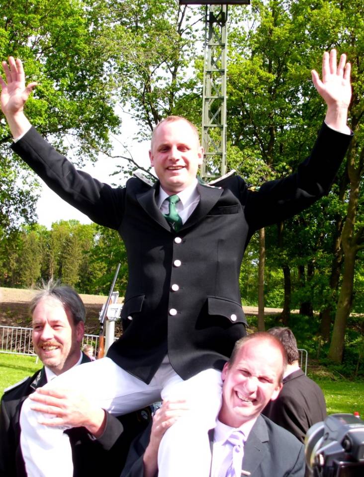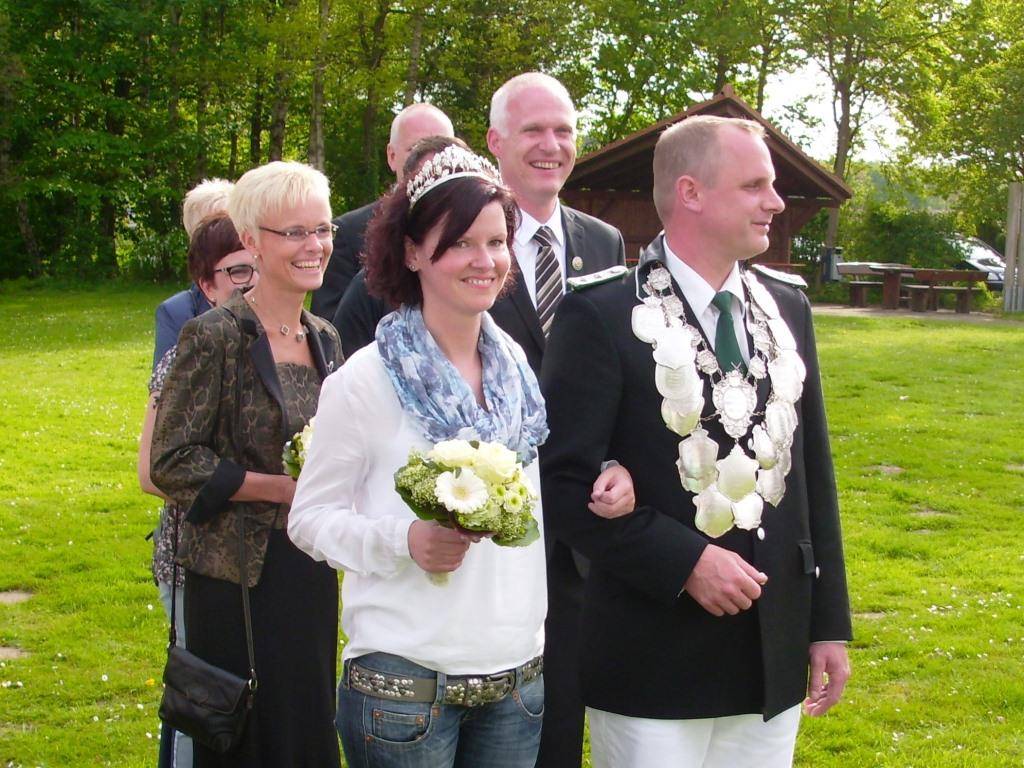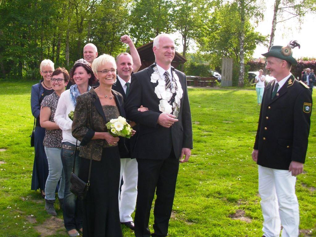 Seine Königin Katja Schlaut hat den entscheidenden Schuss gar nicht erst gesehen. „Ich hab es nicht wirklich mitgekriegt“, gestand sie und war ziemlich nervös, obwohl sie von Brambrinks Vorhaben wusste. Zur Ehrendame ernannte der neue König seine Frau Jennifer. Ehrenherr ist Patrick Dumpe.