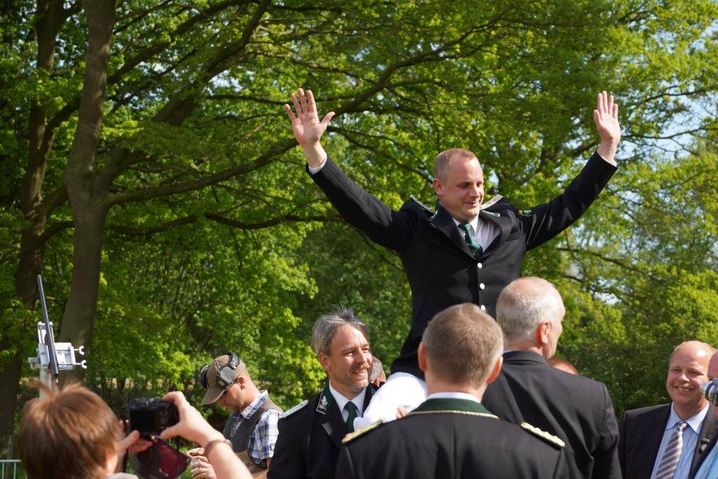 DÜLMEN. Passend zum 25-jährigen Jubiläum – damals regierte sein Vater Paul – holte Dirk Brambrink am Sonntagnachmittag um 16.23 Uhr den Vogel in Börnste von der Stange. „Das war geplant“, verriet der Jungschützenoffizier nach dem erfolgreichen Schuss mit einem Schmunzeln. „Man kriegt das gar nicht so mit. Da fliegt der Vogel – und bums“, berichtete er vom Moment seines Königs-schusses – und gab gleichzeitig zu, dass er „irgendwie erleichtert“ war.