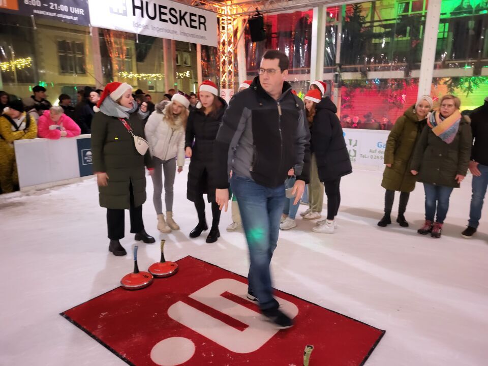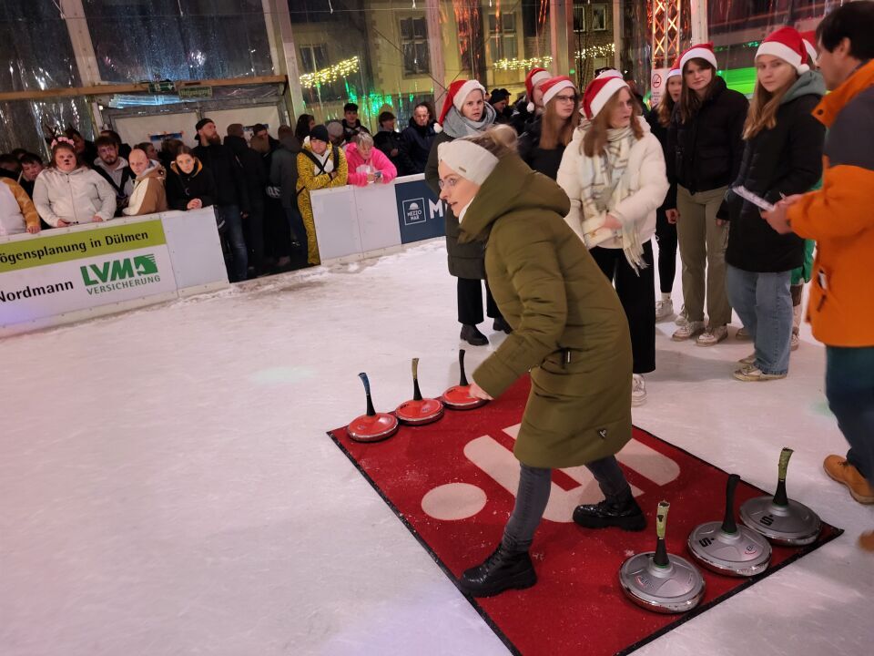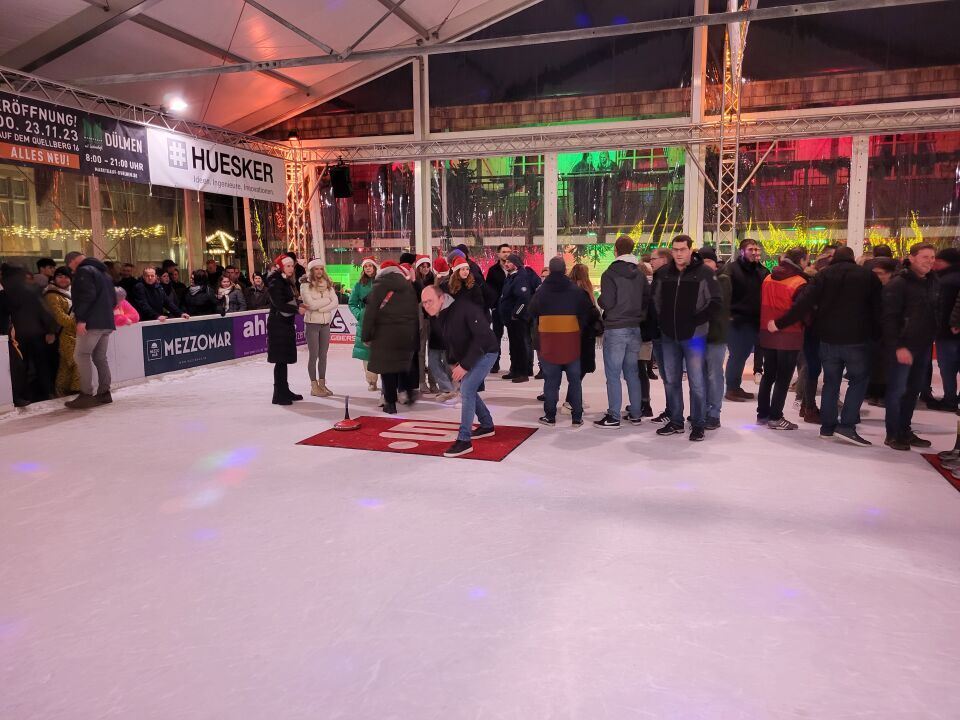 Am Freitagabend war es wieder soweit. Zum Start ins neue Jahr trafen sich alle Dülmener Schützenvereine auf dem Marktplatz. 25 Teams, bestehend aus Abordnungen der Vereine, wagten sich auf das glatte Parkett der überdachten Eisbahn und stellten sich der Herausforderung, die Eisstöcke möglichst nahe ans Ziel zu bringen.