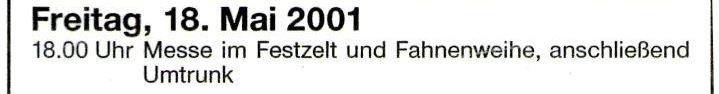 Auch zur hl. Messe, die am Freitagabend im Festzelt gelesen und in der auch unsere neue Vereinsfahne gesegnet wird, darf ich Sie schon jetzt herzlich willkommen heißen.