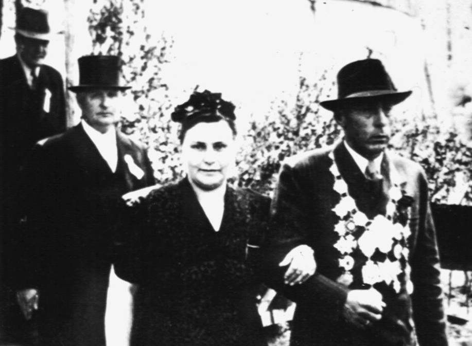 Anschließend begann das Vogelschießen. Erst begann das Schießen verhältnismäßig ruhig bis man den richtigen Ermutigungstropfen genommen und die Donnerbüchse hervorgeholt wurde. Da entfaltete sich ein kleines Ringen um die Königswürde. Mit dem 35. Schuß aus dem vorgenannten Gewehr ging schließlich Herr Heinrich Brambrink als Schützenkönig hervor. Ihm galten allseits besonders herzliche Glückwünsche. Er hatte sein Bestes gegeben um als Sieger hervor zu gehen. Zur Schützenkönigin erkor er sich Frau Bernard Sträter. Sie traf nach einer geraumen Zeit, die die Damen nun alle einmal für sich in Anspruch nehmen, an der Vogelstange ein. Es folgte nun die feierliche Proklamation des neuen Königspaares.