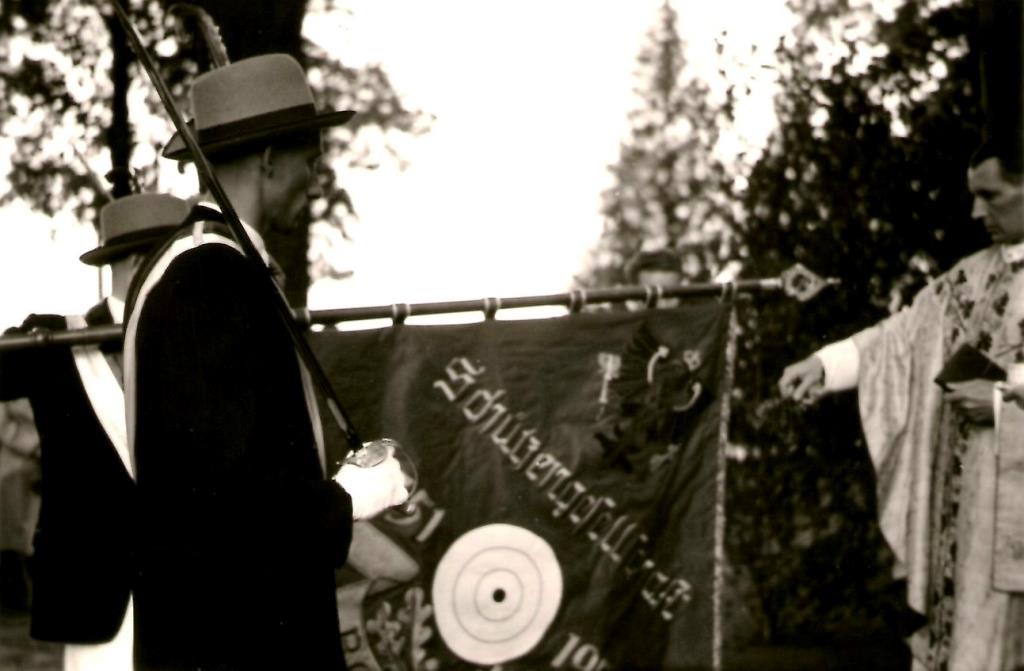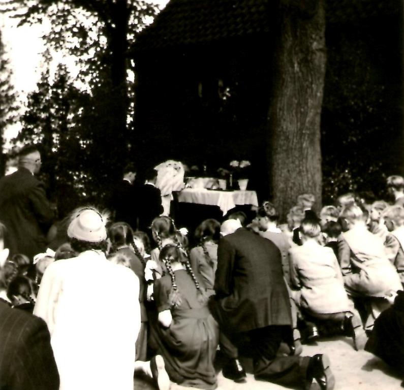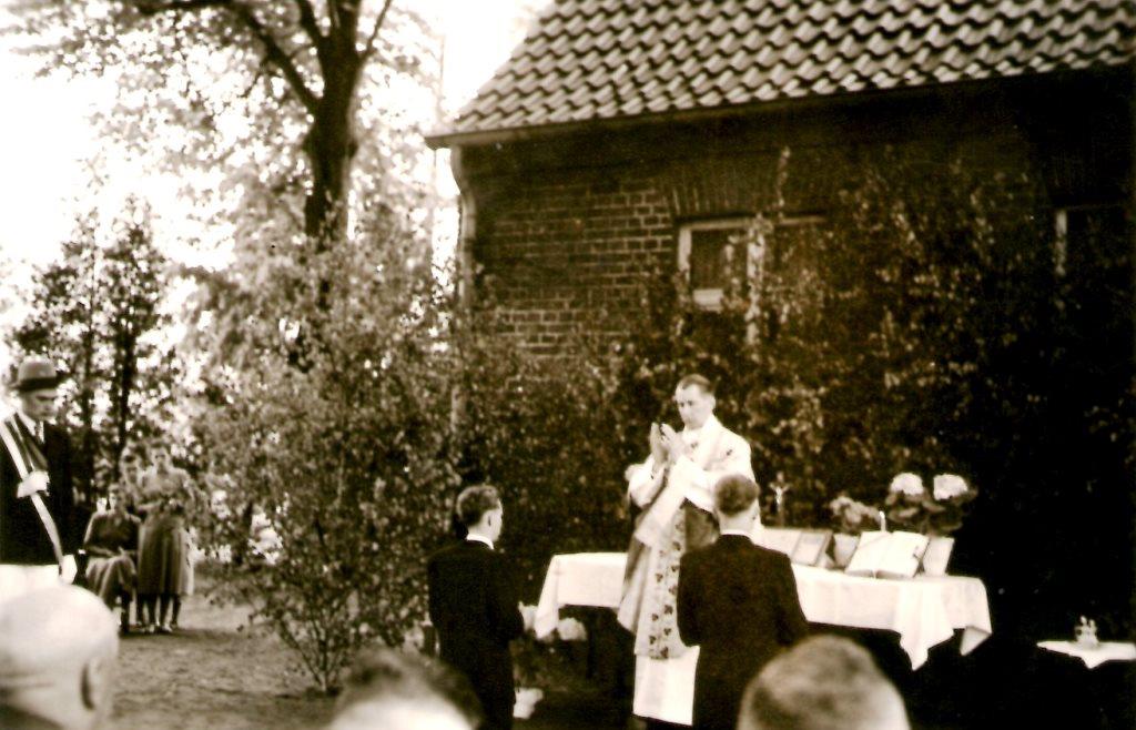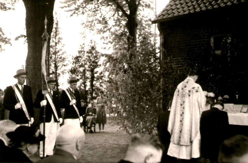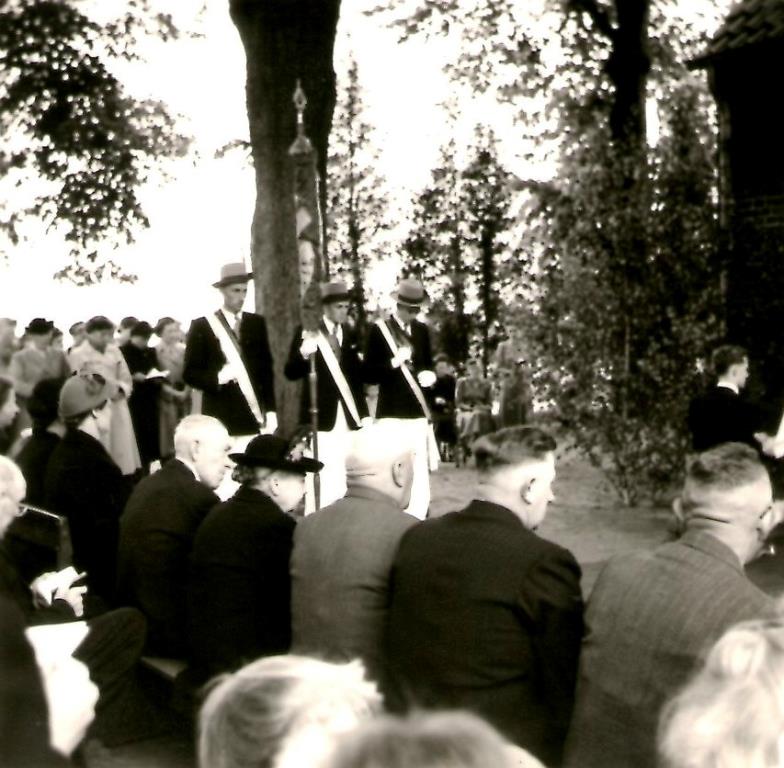 Zu diesem ersten, eigens für die Bauerschaft ange­setzten Feldgottesdienst wurde die neuangeschaff­te Vereinsfahne (noch verhüllt) von den drei Fah­nenoffizieren Anton Töns, Franz Feldmann und Heinrich Krunke mitgenommen.