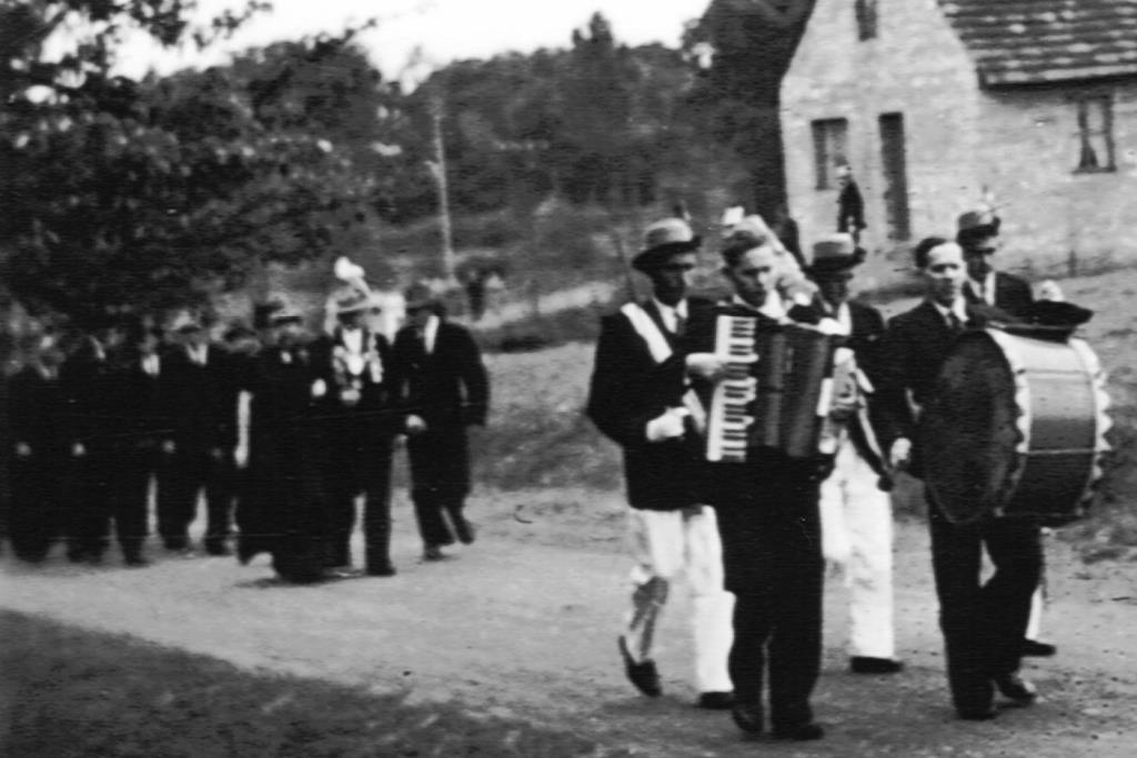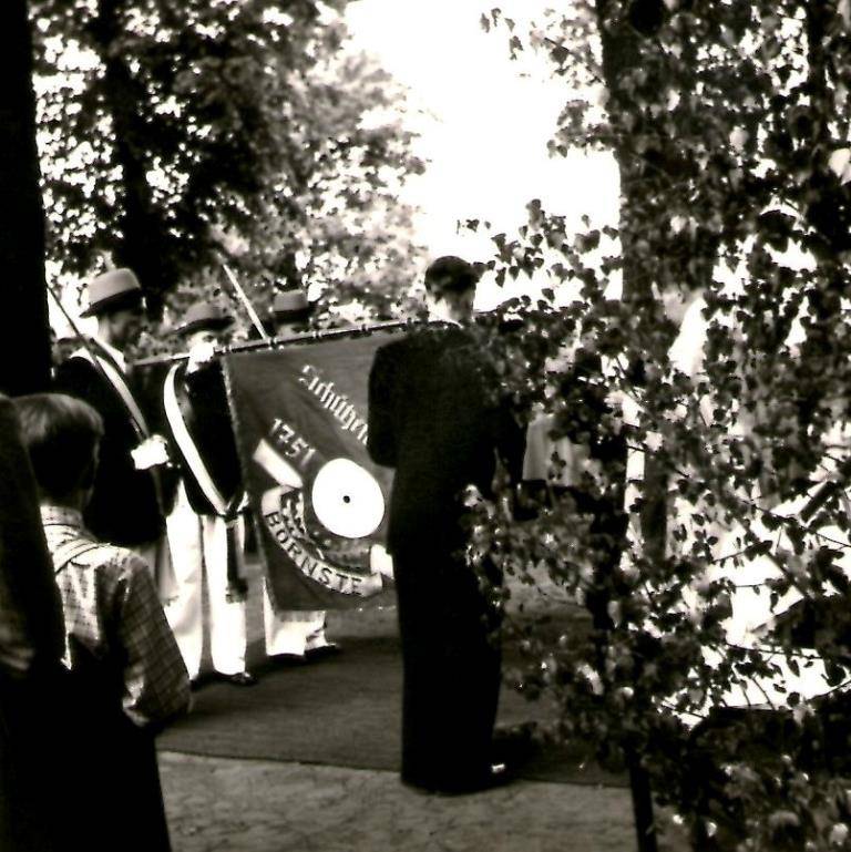Der Schützenzug zog anschließend mit der neuen, stolz im Winde wehenden Fahne und unter Klän­gen der Börnster Musiker, Herrn Josef Lewe und Herrn Paul Potthoff, zurück zum Hofe Brambrink, von wo aus die Schützenbrüder für ein paar Stun­den zur Mittagspause entlassen wurden.