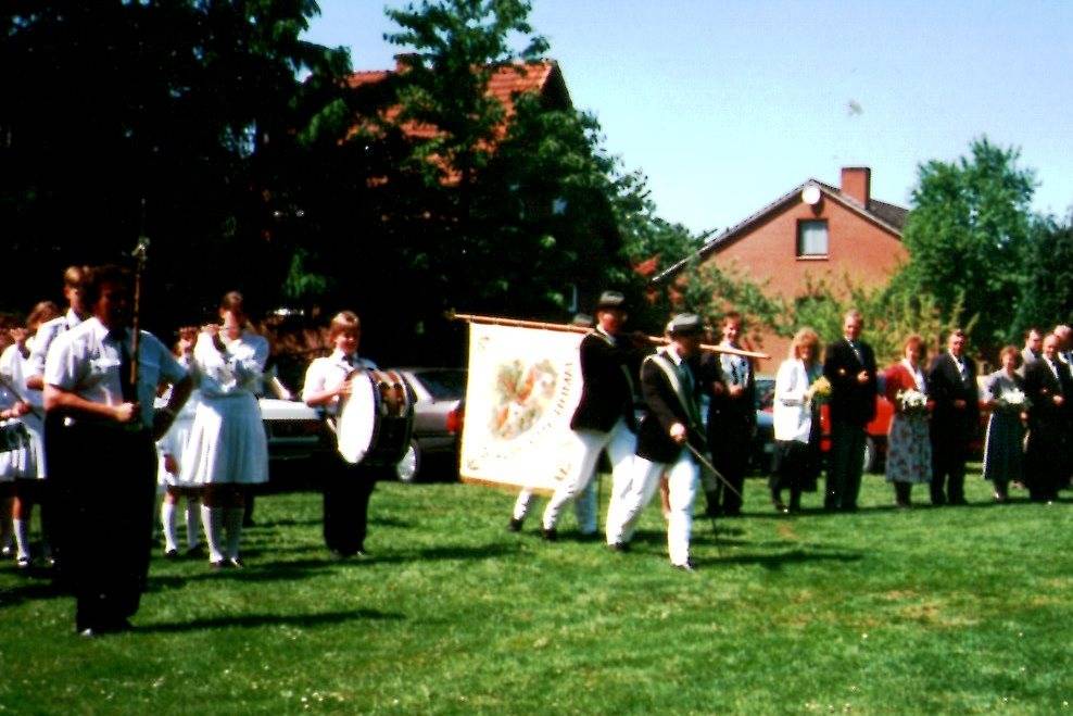 Das dreitägige Fest der Börnster Schützen begann am Samstag abend mit einer Messe in der St.- Viktor-Kirche. Ab 20 Uhr spielte im Festzelt an der ehemaligen Börnster Schule die Band „Desire“ zum Tanz auf. Mit dem Besuch der Veranstaltung war Vorsitzender Josef Lücke sehr zufrieden. Am Sonntag Mittag traten die Schützen auf der Festwiese an. Unter dem Kommando von Schützenkommandeur Franz Wilde marschierten die Grünröcke zum Hof Brambrink, um das noch amtierende Königspaar Willi Wieschhörster und Maria Berning abzuholen. Zu den Klängen der Stadtkapelle Dülmen folgte der Marsch zur Vogelstange.